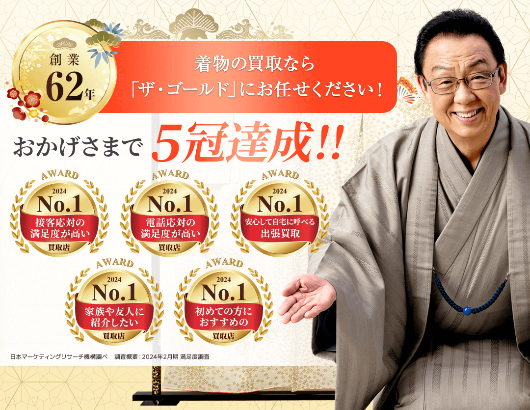 ザ・ゴールドは、62年以上もの歴史がある老舗の買取専門店です。特に着物買取には強く、専門の査定士が豊富な知識を持ち高額査定が多いのが特徴。全国に店舗があり、電話やメールで査定予約ができ、独自の販売ルートもあるため高額買取が可能です。査定は劣化した着物1点でも可能で、査定額に納得できない場合は全品返却してOK。安心感のある対応で初めて着物を売る方に特にオススメです!